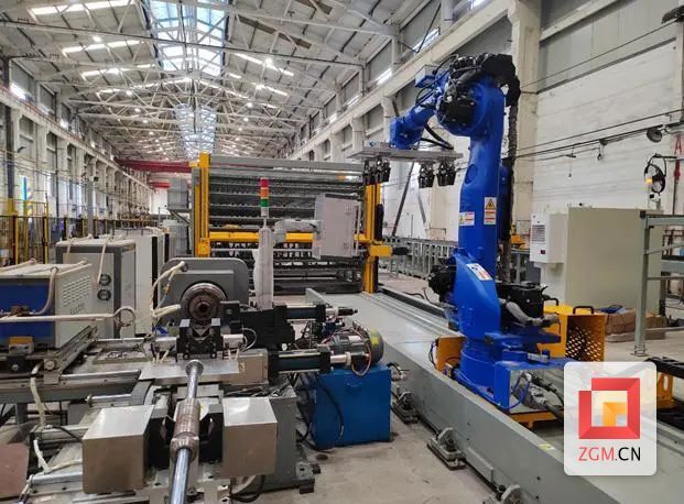 系統(tǒng)工作時(shí)由兩個(gè)機(jī)器人協(xié)同實(shí)現(xiàn)上下料和轉(zhuǎn)運(yùn),完成不同規(guī)格、長度的集箱長管接頭生產(chǎn),利用程序數(shù)據(jù)庫,通過簡單參數(shù)錄入和篩選,實(shí)現(xiàn)不同圖號(hào)長管接頭加工程序的自適應(yīng)匹配和自動(dòng)推進(jìn),從而達(dá)到集箱長管接頭備料彎管的全流程自動(dòng)化生產(chǎn)。經(jīng)過二十天全線封閉試生產(chǎn),全線效率達(dá)到三分鐘一件,大幅縮短了生產(chǎn)周期,提高了產(chǎn)品質(zhì)量控制水平,降低了勞動(dòng)強(qiáng)度,為安全、優(yōu)質(zhì)、智能、環(huán)保生產(chǎn)提供了有效保障。