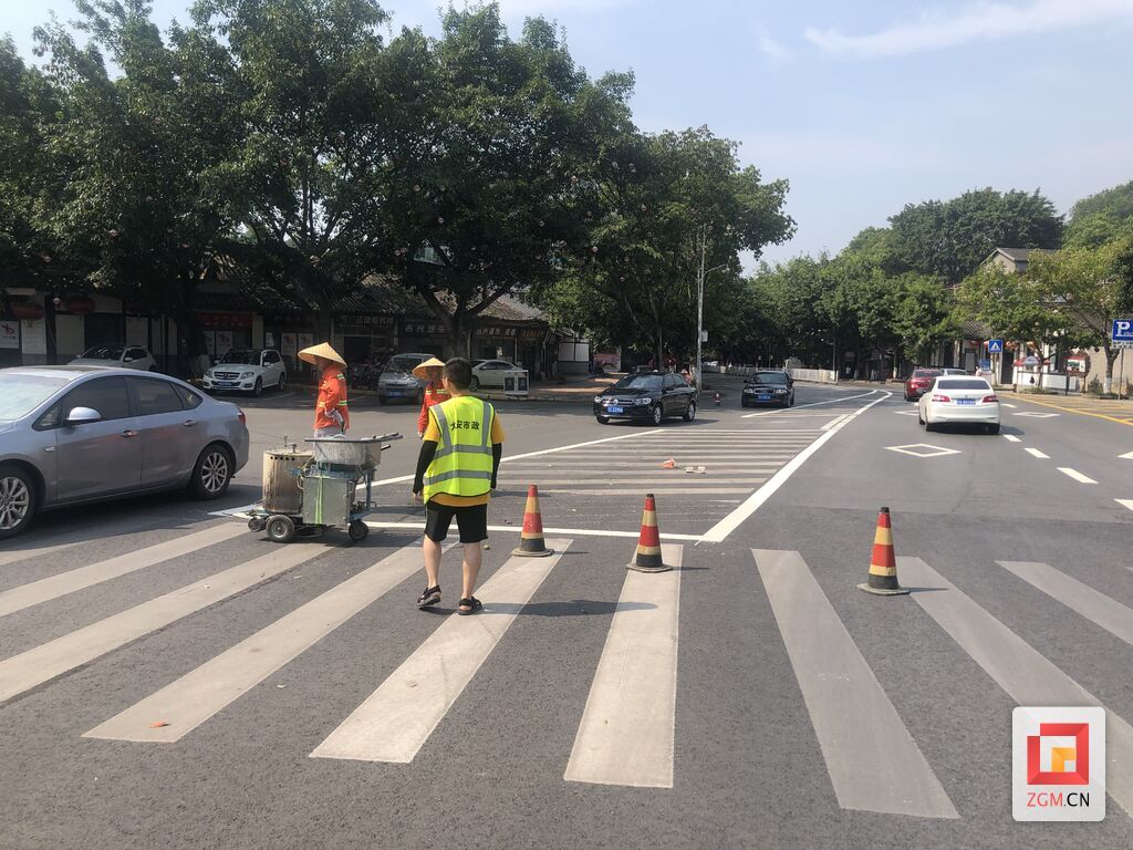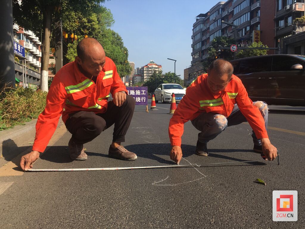 “來摸一哈地面,久了真遭不??!”即便為了搶抓溫度相對(duì)低一些的時(shí)段施工,此時(shí)的室外溫度也達(dá)到了四十幾度。負(fù)責(zé)劃初線的師傅黃述章剛蹲下來一會(huì)兒,豆大的汗珠從腦門滾落。按照安全生產(chǎn)要求,他還得把制服穿得嚴(yán)嚴(yán)實(shí)實(shí)。施劃前,大家須先除凈路面灰塵雜物和泥土,然后按照設(shè)計(jì)的線形要求,依次完成放樣、劃線、抹膠、涂料等工序。