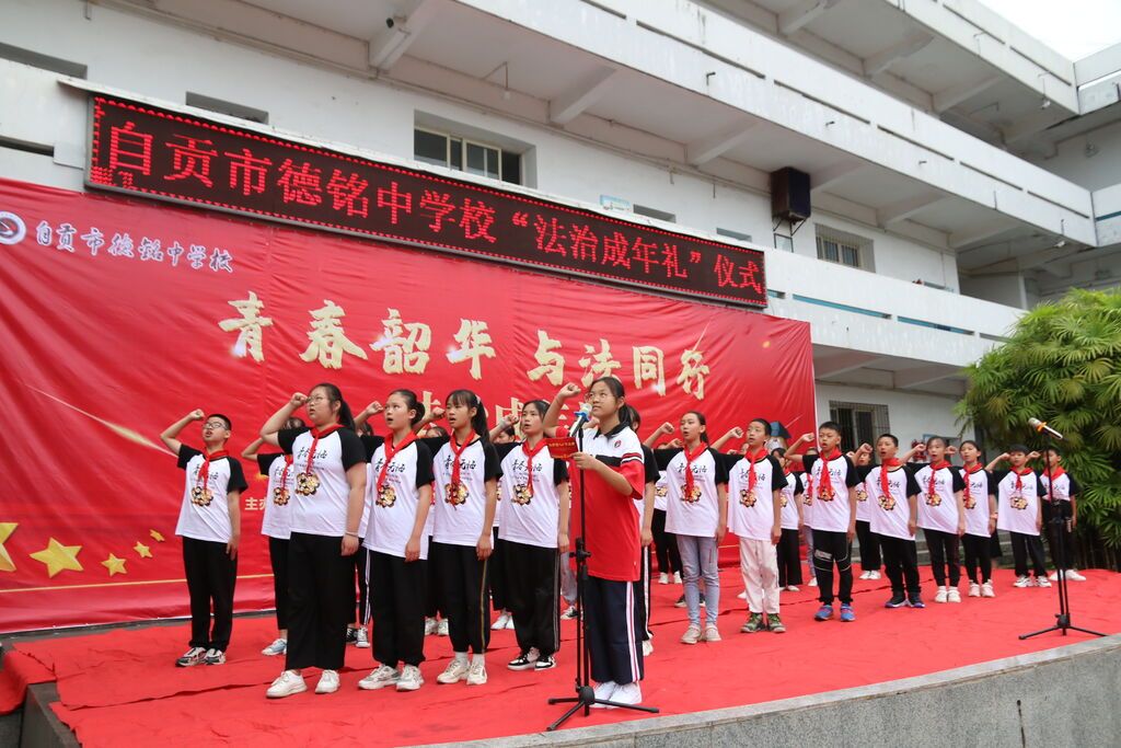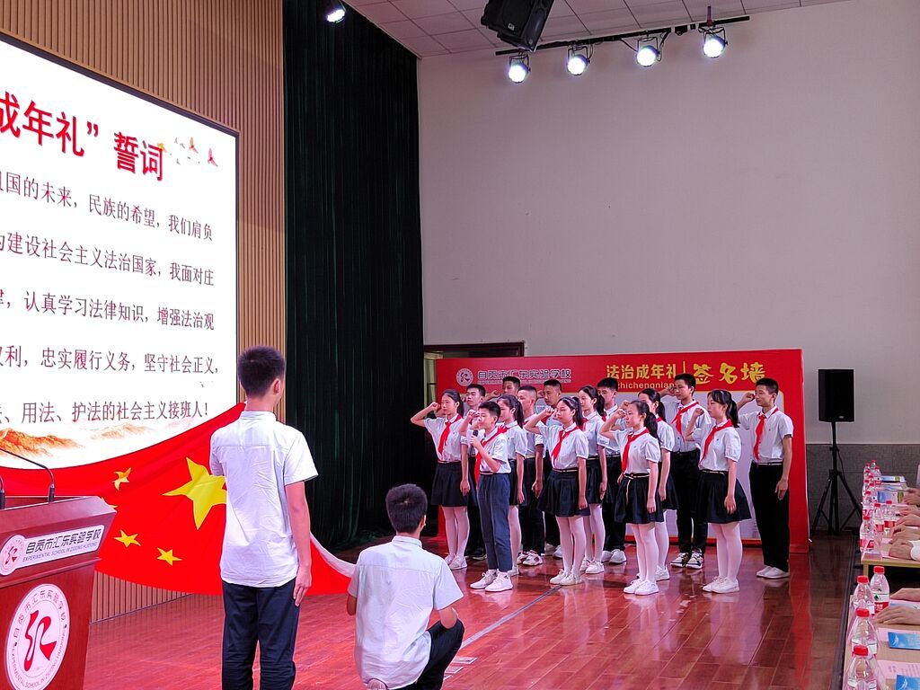 “我宣誓:忠于憲法和法律,認(rèn)真學(xué)習(xí)法律知識,增強法治觀念,維護法律權(quán)威……”6月20日,自貢市匯東實驗學(xué)校舉行“法治成年禮”活動,該校年滿12周歲的學(xué)生面對國旗莊嚴(yán)宣誓,并在承諾書上簽下自己的姓名,承諾做尊法、知法、守法、用法、護法的社會主義接班人。