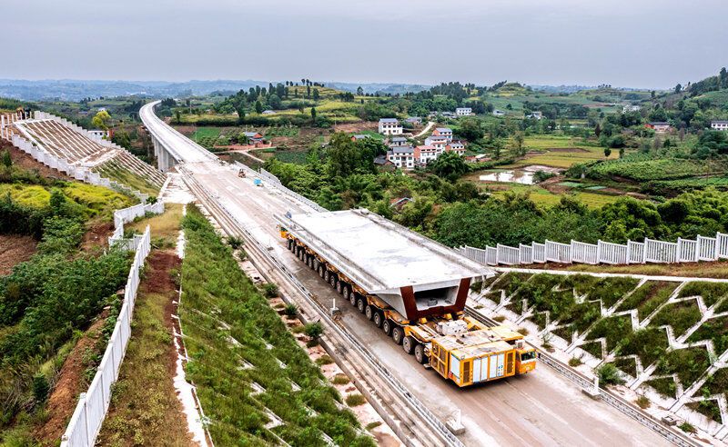 成自宜高鐵是我國“八縱八橫”高速鐵路網(wǎng)中京昆通道的重要組成部分,設(shè)計時速350公里,全長約259公里,全線需架設(shè)3928孔箱梁,目前先期完成標段架設(shè)的是由中鐵五局承擔的成自高鐵站前6標569孔箱梁。