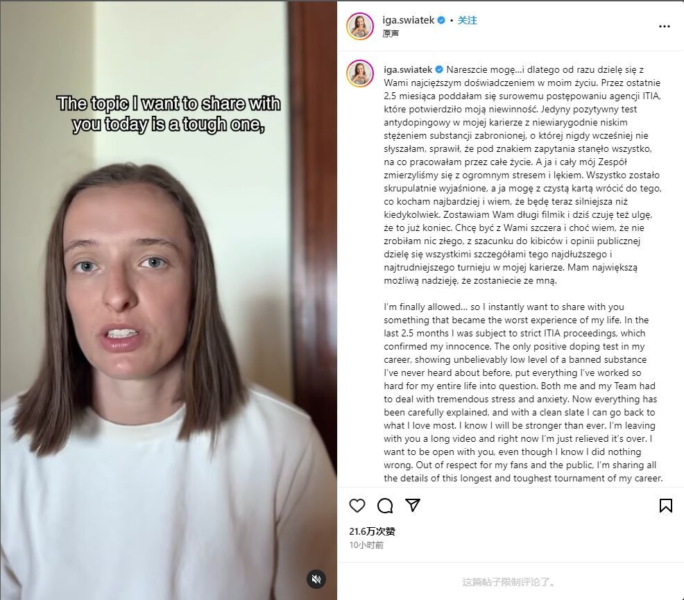 斯瓦泰克也就此事作出回應(yīng)。她透露在過去兩個(gè)半月里,自己接受了嚴(yán)格的ITIA程序,證實(shí)了清白,“我職業(yè)生涯中唯一一次興奮劑檢測(cè)呈陽(yáng)性,結(jié)果顯示來自一種我從未聽說過的違禁藥物,含量低得令人難以置信,這讓我努力的結(jié)果受到質(zhì)疑?!?/p>