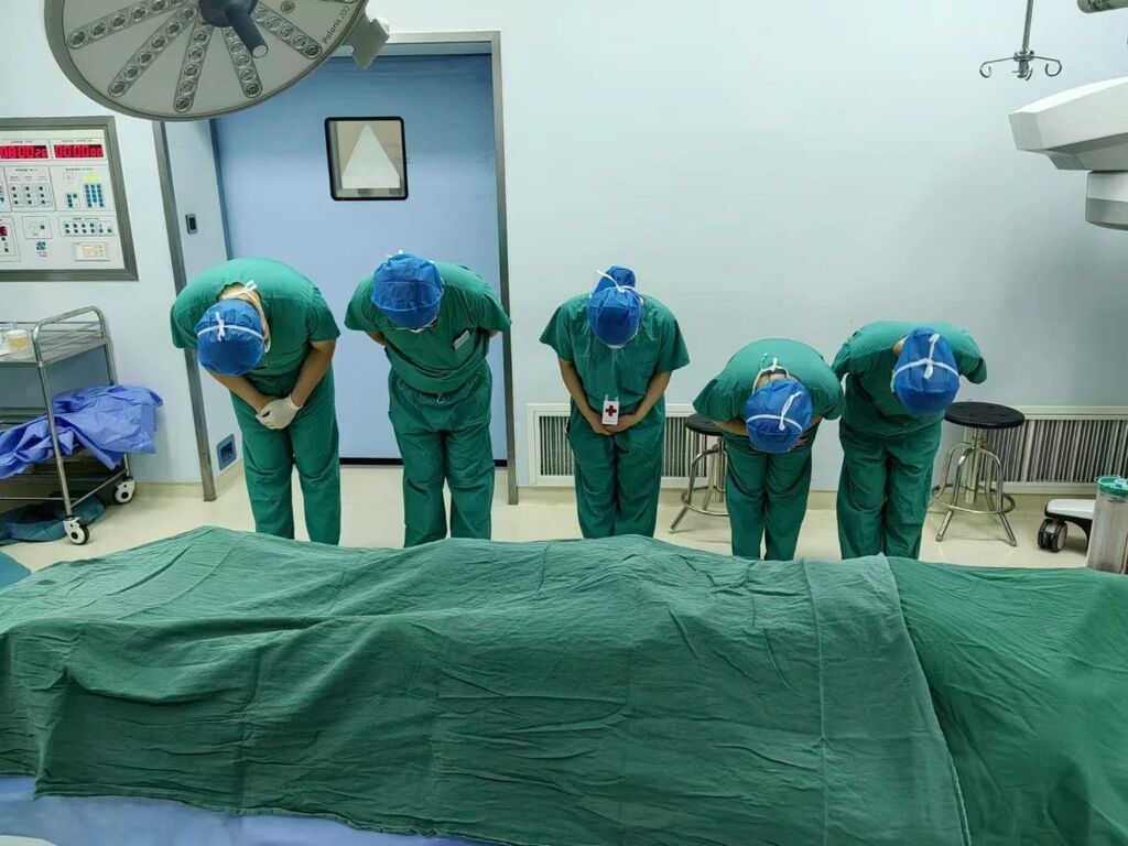 手術(shù)室里,曉云被撤掉了呼吸機(jī),醫(yī)務(wù)人員和紅十字會(huì)工作人員在曉云的遺體前進(jìn)行了默哀,向這位女孩送上了真摯的敬意。