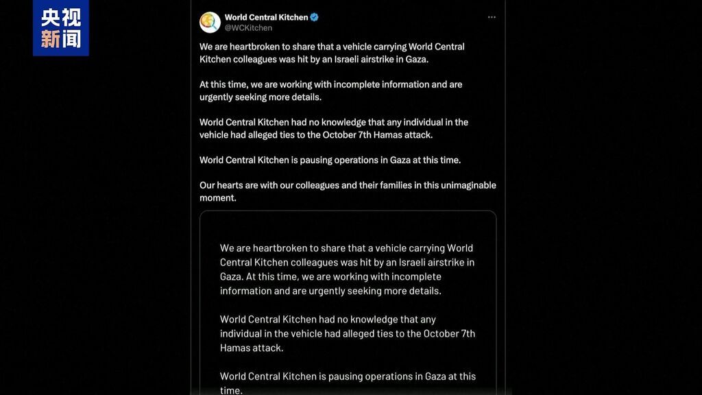 “世界中央廚房”同一天發(fā)表聲明,確認隸屬于該機構的車輛當天在加沙地帶遭襲,但尚不能確認遭襲的細節(jié)。目前,“世界中央廚房”已宣布暫停在加沙地帶的運營工作。