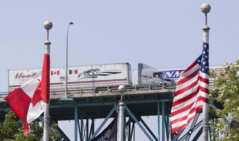 2017年8月16日,在加拿大安大略省溫莎市,一輛印有墨西哥、加拿大與美國(guó)國(guó)旗的長(zhǎng)途貨車(左)通過(guò)大使橋開(kāi)往美國(guó)。新華社發(fā)(鄒崢攝)