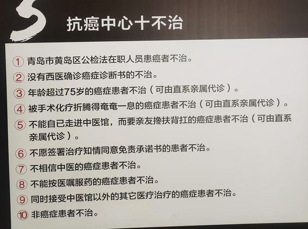 這塊牌子掛在藥王谷中醫(yī)館四合院的西房大廳,是患者前去就醫(yī)首站到達之處,那里是接受患者咨詢以及導醫(yī)的工作室,其第一條內(nèi)容是“青島市黃島區(qū)公檢法在職人員患癌者不治”。