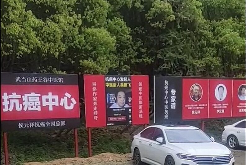 視頻中,藥王谷中醫(yī)館停車場一塊紅底白字的“抗癌中心”牌子格外醒目,一旁是六名中醫(yī)抗癌專家和六名導醫(yī)的宣傳牌。宣傳牌一字排開,每塊牌子約2平方米,上半部為專家或?qū)пt(yī)的頭像,下面是簡介,每個專家名頭都有“中醫(yī)抗癌專家組成員”幾個字。