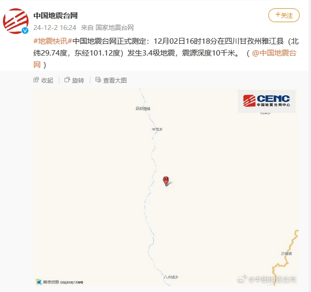 央視網(wǎng)消息:中國地震臺網(wǎng)正式測定:12月02日16時18分在四川甘孜州雅江縣(北緯29.74度,東經(jīng)101.12度)發(fā)生3.4級地震,震源深度10千米。