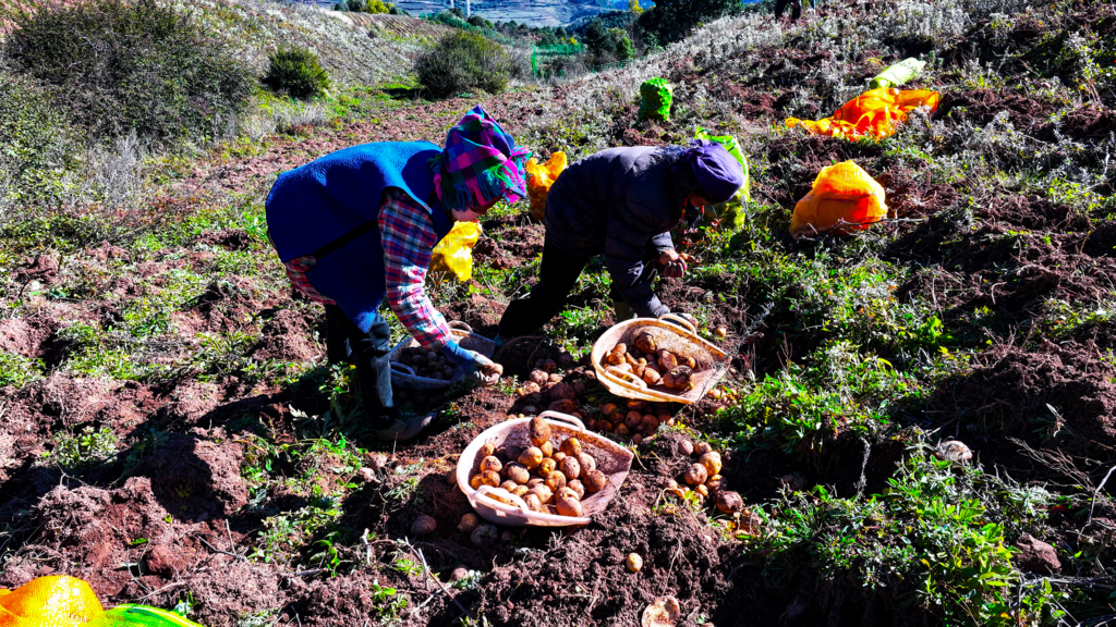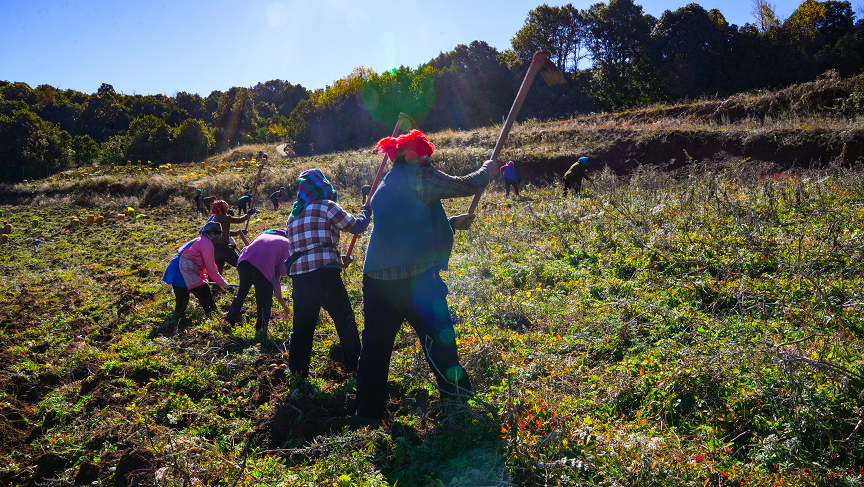 走進(jìn)普格縣“天府糧倉·百縣千片”馬鈴薯高產(chǎn)競賽示范基地,只見村民們正趁著晴朗的好天氣,熱火朝天地進(jìn)行馬鈴薯的采挖工作。田間地頭,到處都是村民們忙碌的身影。在鋤頭、釘耙等農(nóng)具的翻動下,一個個圓潤飽滿、色澤誘人的洋芋破土而出,不一會就堆滿了田間地壟,大家熟練地進(jìn)行分揀、裝袋、搬運(yùn)……呈現(xiàn)出一派熱鬧非凡、豐收在望的喜人景象。
