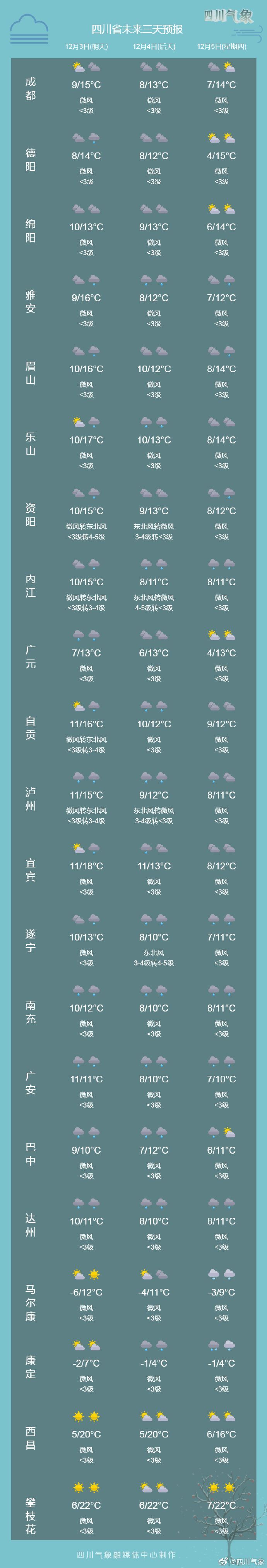 四川省氣象臺今天下午發(fā)布的最新天氣預報:12月2日晚上至5日白天,盆地大部有陣雨或小雨,東北部局地有中雨;4日至5日川西高原東部有小雪,局部中到大雪,需防范雨雪天氣對交通運輸?shù)葞淼牟焕绊憽?/p>