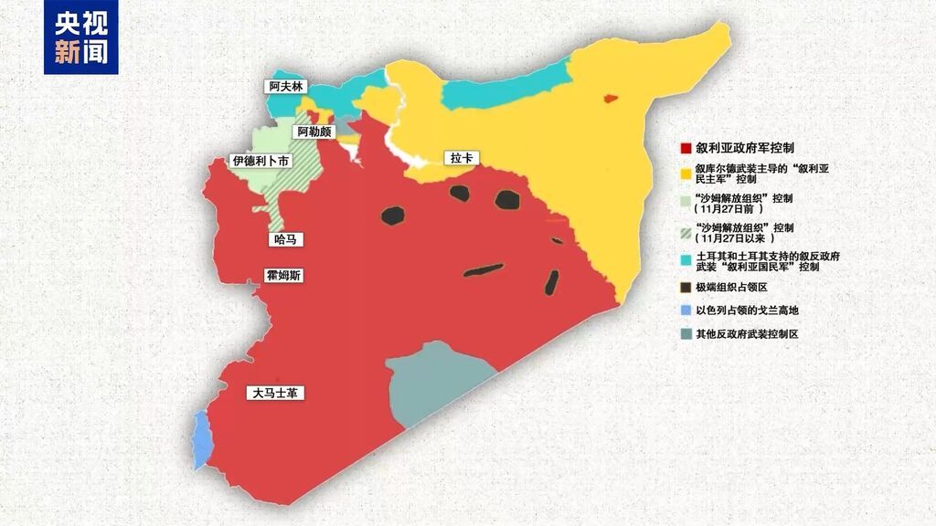 截至12月1日,敘利亞政府軍控制著敘絕大多數(shù)領(lǐng)土,包括首都大馬士革、重要城市霍姆斯,以及目前正在與反政府武裝激烈爭奪的哈馬省。