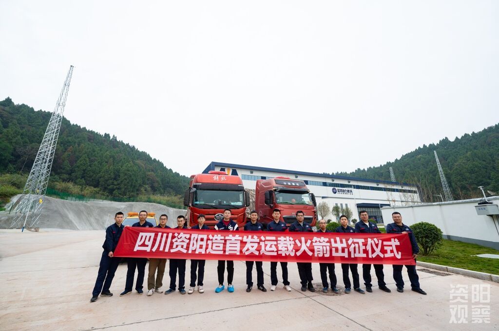 “出發(fā)!”12月2日下午,一場(chǎng)簡(jiǎn)單而莊重的“資陽造”首發(fā)運(yùn)載火箭出征儀式在四川星河動(dòng)力空間科技有限公司飛行器總裝制造基地(一期)舉行,隨著主持人一聲令下,裝載火箭部件的兩輛重卡和一輛保障車緩緩開出廠區(qū)駛向發(fā)射場(chǎng)。