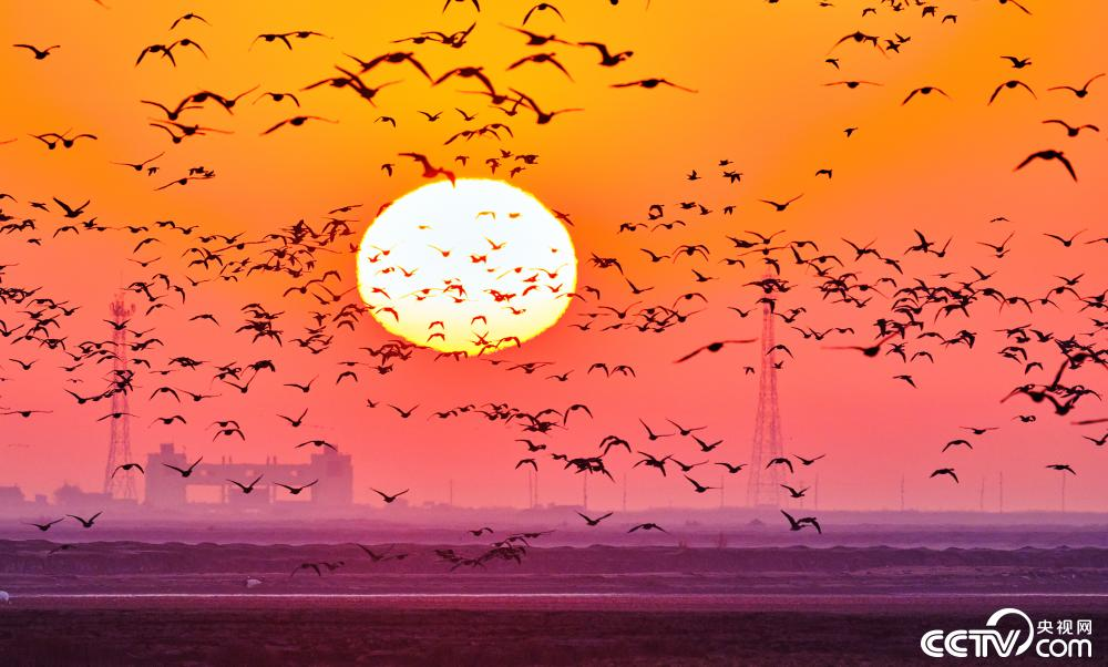 12月2日,山東東營黃河三角洲國家級自然保護區(qū)濕地上空現(xiàn)“鳥浪”景觀。在絢爛的朝霞背景下,鳥兒成群結(jié)隊空中“作畫”。