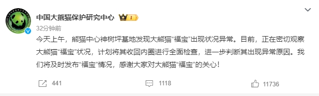 ·據(jù)@中國大熊貓保護研究中心消息,12月3日上午,熊貓中心神樹坪基地發(fā)現(xiàn)大熊貓“福寶”出現(xiàn)狀況異常。目前,正在密切觀察大熊貓“福寶”狀況,計劃將其收回內(nèi)圈進行全面檢查,進一步判斷其出現(xiàn)異常原因。