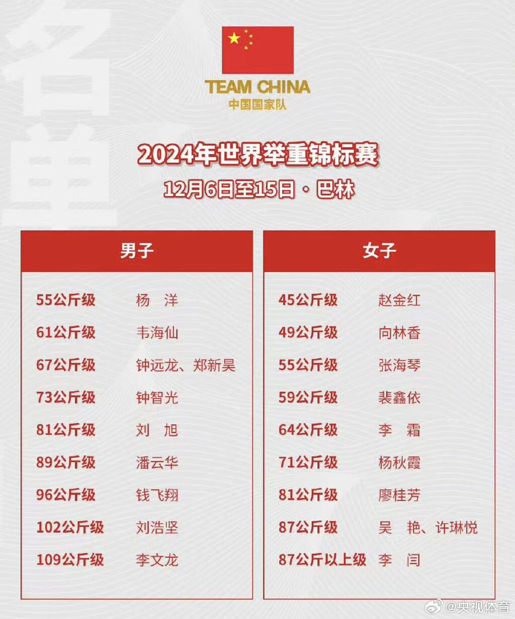 2024年世界舉重錦標賽將于12月6日-15日在巴林舉行。本次世錦賽中國隊沒有派出李發(fā)彬、侯志慧等巴黎奧運會冠軍得主,而是主打年輕陣容。全隊滿額20人參賽,其中18人為近期國內(nèi)涌現(xiàn)出的新鮮面孔,中國隊的目標是鍛煉新人、夯實備戰(zhàn)洛杉磯奧運會后備力量。屆時,請鎖定CCTV5和央視體育客戶端,一起為中國隊加油!