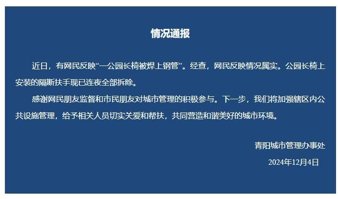 央視網消息:據昆山開發(fā)區(qū)發(fā)布微信公眾號消息,近日,有網民反映“一公園長椅被焊上鋼管”。經查,網民反映情況屬實。公園長椅上安裝的隔斷扶手現已連夜全部拆除。