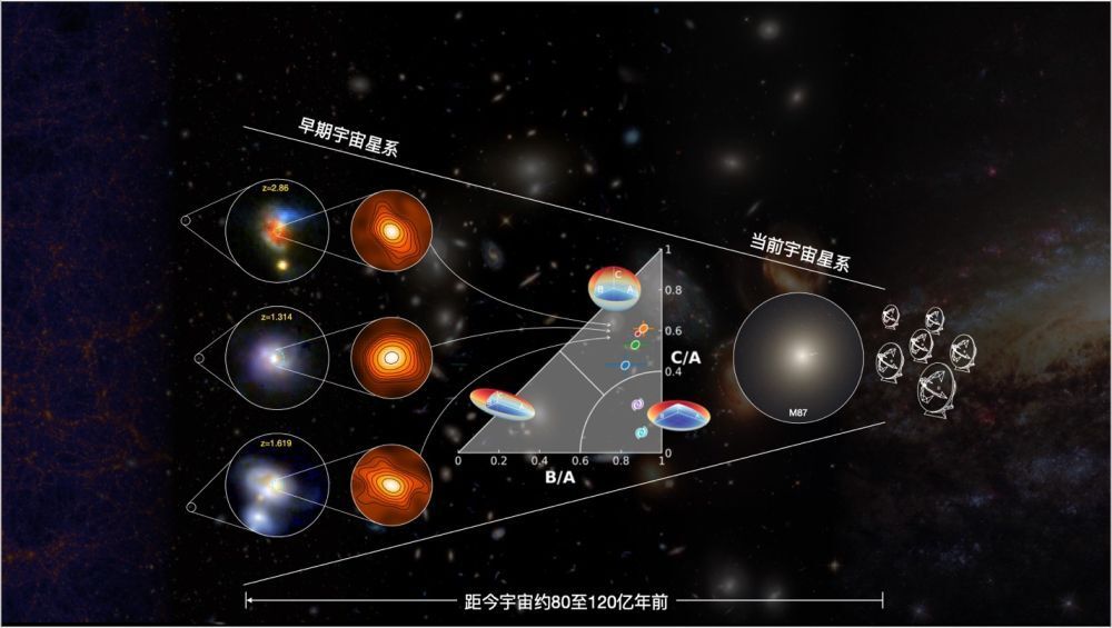 進(jìn)一步宇宙學(xué)流體力學(xué)模擬則顯示,冷氣體吸積流入星系以及星系相互作用觸發(fā)的劇烈恒星形成活動,很可能是導(dǎo)致這些星系核球結(jié)構(gòu)形成的主要原因。這一過程在早期宇宙中非常普遍。