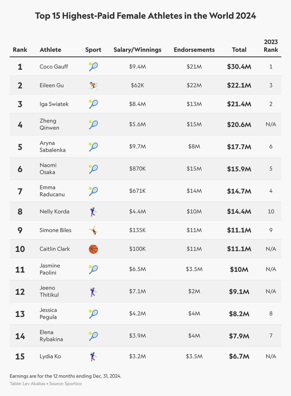 網(wǎng)球運(yùn)動(dòng)再次展現(xiàn)了其全球影響力。在這份排行榜TOP15中,有多達(dá)9位網(wǎng)球選手,包括排名第一的美國名將高芙(3040萬美元)。