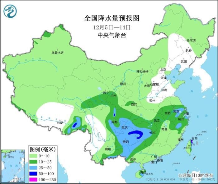 未來10天(12月5-14日),西南地區(qū)東部、江漢、江淮、江南、華南西部等地累計(jì)降水量有10~30毫米,局地40~60毫米;新疆西北部、西北地區(qū)中東部、山東半島等地累計(jì)降水量有5~8毫米,局地10~15毫米。