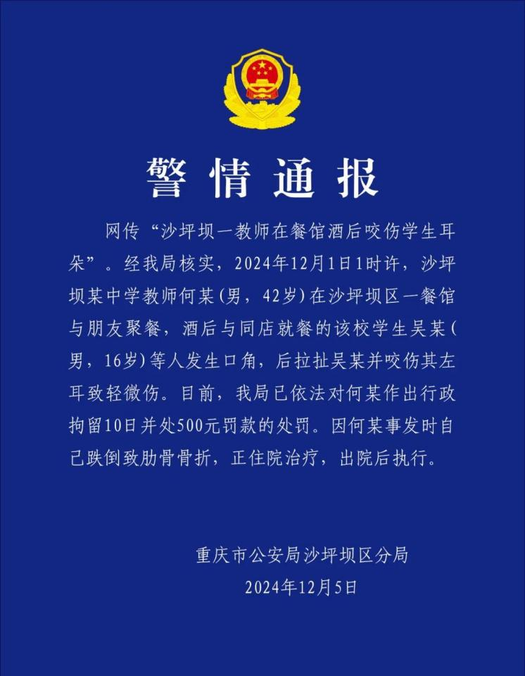 ·重慶一教師在餐館酒后咬傷學(xué)生耳朵,警方:行拘10日。
