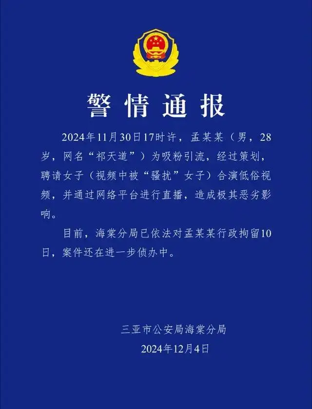 ·網(wǎng)紅“祁天道”聘用女子合演不雅直播被拘,賬號(hào)已被封禁。