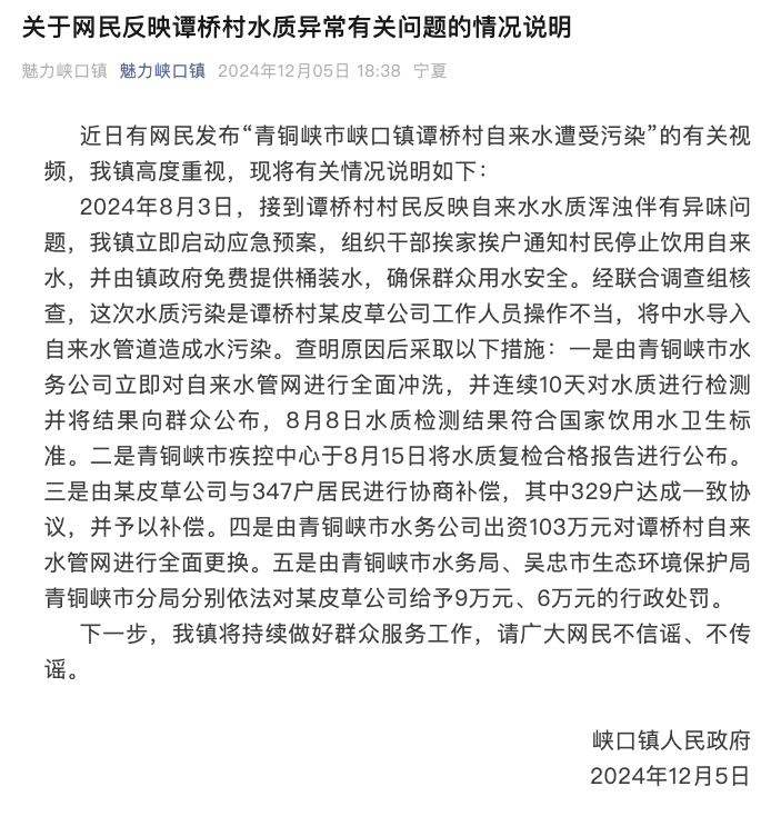 ·寧夏吳忠通報(bào)自來(lái)水污染:皮草公司操作不當(dāng)將中水導(dǎo)入管道被處罰。