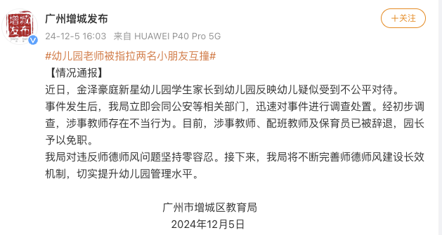 ·廣州一幼兒園老師被指拉兩名小朋友互撞,教育局通報(bào):涉事教師被辭退,園長(zhǎng)免職。