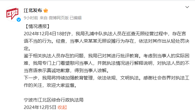 ·攤販沒錢交罰款被城管要求去借錢?寧波江北通報(bào):對(duì)執(zhí)法人員不當(dāng)言語(yǔ)表示歉意。
