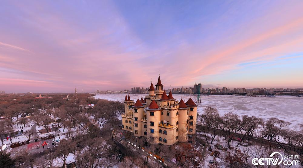12月4日,黑龍江省哈爾濱市,嚴(yán)冬時(shí)節(jié),松花江上晚霞漫卷,燦爛如畫。太陽(yáng)島以及太陽(yáng)城堡、過江索道還有道里江畔,諸多地標(biāo)掩映其間,為冬日添景。