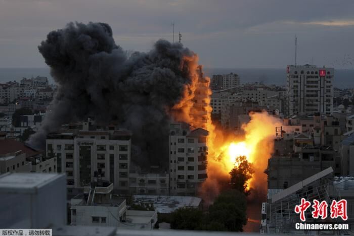 當(dāng)?shù)貢r間2023年10月7日,以色列空襲加沙地帶,一座巴勒斯坦公寓大樓爆炸,火球和煙霧上升。