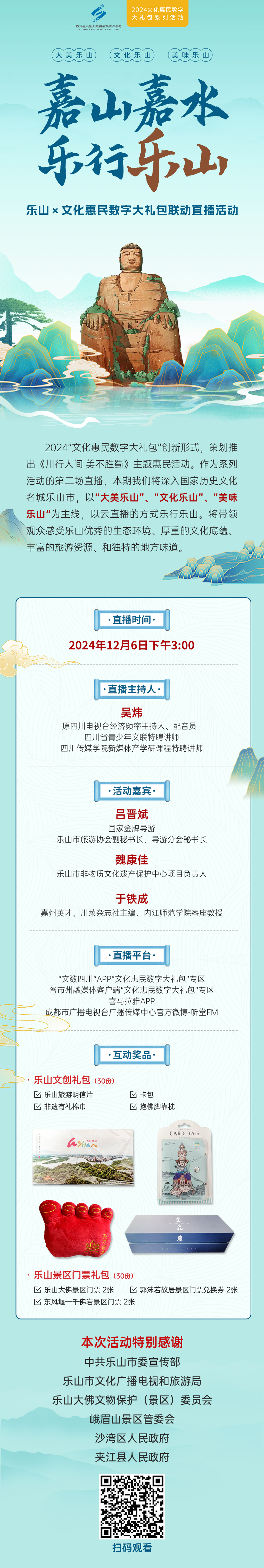 12月6日,讓我們相約“嘉山嘉水·樂行樂山”,一起走進(jìn)這座文化與自然交融的魅力之城,探索屬于樂山的無限美好。鎖定直播,不見不散!