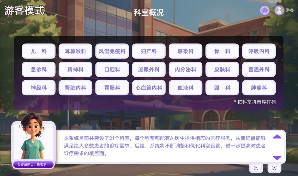 在內(nèi)測(cè)版“AI醫(yī)院”系統(tǒng)內(nèi),42位“醫(yī)生”兩兩一組,在兒科、耳鼻喉科、呼吸內(nèi)科、皮膚科等21個(gè)科室“坐診”。來看病的患者也都是人工智能模擬的。整個(gè)流程和真實(shí)醫(yī)院一樣,患者進(jìn)醫(yī)院,經(jīng)過分診、問診,再到檢查、診斷,然后取藥、治療等。