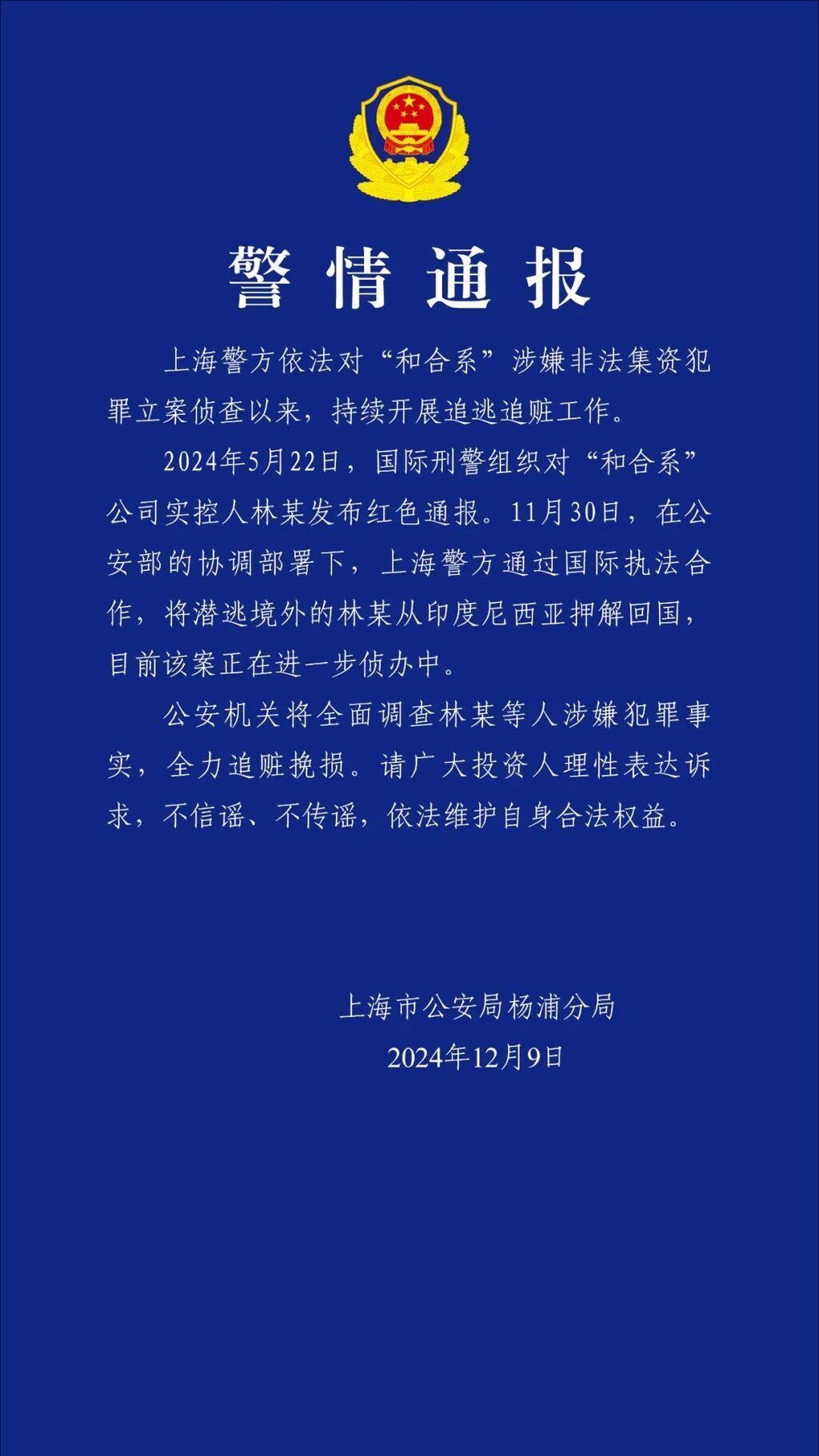 2024年5月22日,國(guó)際刑警組織對(duì)“和合系”公司實(shí)控人林某發(fā)布紅色通報(bào)。11月30日,在公安部的協(xié)調(diào)部署下,上海警方通過國(guó)際執(zhí)法合作,將潛逃境外的林某從印度尼西亞押解回國(guó),目前該案正在進(jìn)一步偵辦中。