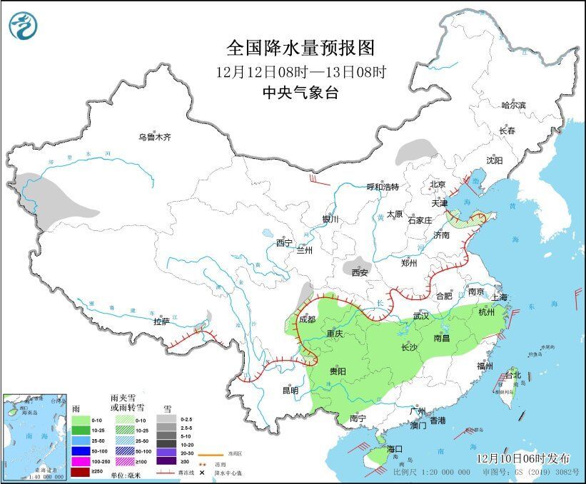 12月10日08時至11日08時,新疆沿天山一帶和南疆盆地西部山區(qū)、內(nèi)蒙古西南部、西藏東部、青海中東部、西北地區(qū)東部、山西中南部等地部分地區(qū)有小到中雪或雨夾雪,其中,新疆沿天山一帶和西藏東南部局地大到暴雪(10~14毫米)。西南地區(qū)東部、江南西部和北部、江漢東部、江淮、華南西部等地部分地區(qū)有小到中雨。內(nèi)蒙古東南部、遼東半島等地部分地區(qū)有5~6級風(fēng),西藏中西部有7~8級風(fēng)。