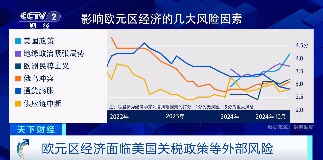 根據(jù)彭博社對(duì)經(jīng)濟(jì)學(xué)家的最新調(diào)查,可以看到美國(guó)政策,以及國(guó)際地緣政治的緊張局勢(shì)已逐漸躍升為歐元區(qū)經(jīng)濟(jì)面臨的兩大關(guān)鍵風(fēng)險(xiǎn)。