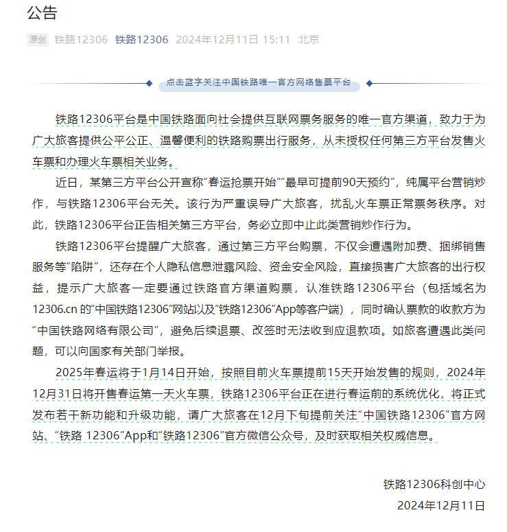 近日,某第三方平臺(tái)公開(kāi)宣稱“春運(yùn)搶票開(kāi)始”“最早可提前90天預(yù)約”,純屬平臺(tái)營(yíng)銷炒作,與鐵路12306平臺(tái)無(wú)關(guān)。該行為嚴(yán)重誤導(dǎo)廣大旅客,擾亂火車票正常票務(wù)秩序。對(duì)此,鐵路12306平臺(tái)正告相關(guān)第三方平臺(tái),務(wù)必立即中止此類營(yíng)銷炒作行為。