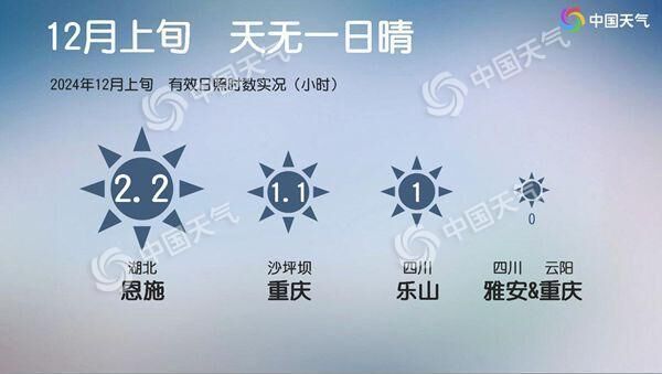 在剛剛結(jié)束的12月上旬里,南方多地陰雨不斷,不少地區(qū)累積日照時(shí)數(shù)偏少。其中,四川東部、重慶、貴州、湖南西部、湖北西南部一帶是全國降水日數(shù)最多、日照最少的區(qū)域,今年12月上旬上述地區(qū)累積日照時(shí)數(shù)比常年同期偏少,大多不足10小時(shí),部分站點(diǎn)不足5小時(shí)甚至1小時(shí),最少的是四川雅安和重慶云陽,整個(gè)12月上旬的有效日照時(shí)數(shù)甚至低至0小時(shí)。