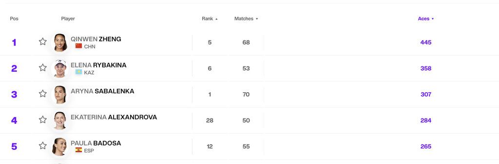 根據(jù)WTA(女子網(wǎng)球協(xié)會)年終ACE球(發(fā)球直接得分,且對手未碰到球)排名顯示,中國球員鄭欽文在本賽季參加的68場比賽共打出445記ACE球,是所有球員中最多的,領先第二名萊巴金娜87個之多,成為年度ACE女王。