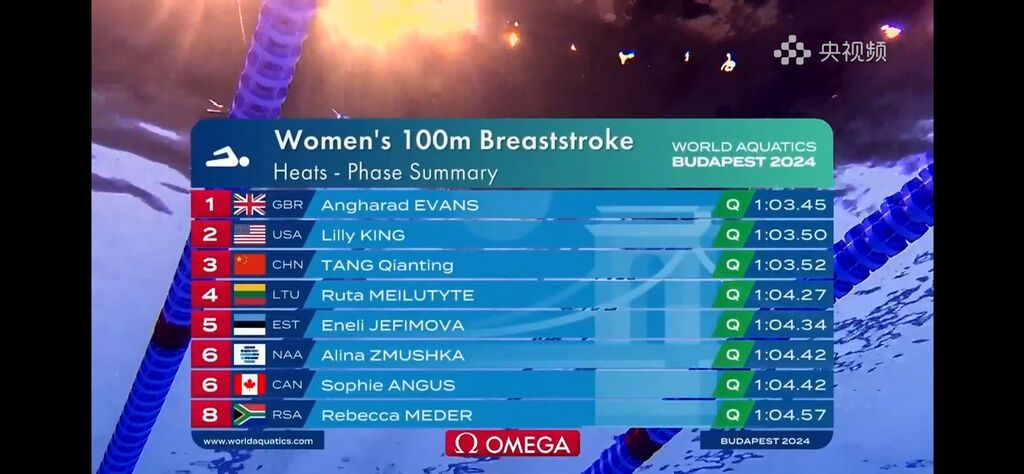 北京時間12月11日下午,2024年短池游泳世錦賽多項預(yù)賽在匈牙利首都布達(dá)佩斯的多瑙游泳館進(jìn)行。在女子100米蛙泳預(yù)賽中,上演本次比賽首秀的唐錢婷排名所有選手第三位,晉級半決賽。