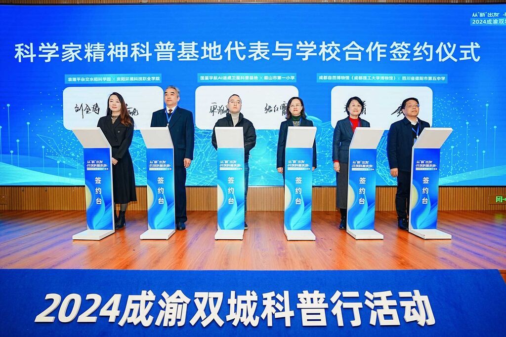 為弘揚(yáng)科學(xué)家精神,凝聚科技創(chuàng)新力量,推動(dòng)科學(xué)家精神進(jìn)校園落地見(jiàn)效,充分激發(fā)成渝兩地青少年愛(ài)科學(xué)、學(xué)科學(xué)、用科學(xué)的熱情,現(xiàn)場(chǎng),成渝兩地弘揚(yáng)科學(xué)家精神的科普基地分別與成渝兩地及德眉資中小學(xué)校簽署合作協(xié)議,搭建成渝及成都都市圈科普資源對(duì)接平臺(tái),為提升青少年科學(xué)素養(yǎng)、培育科學(xué)精神提供有力支撐。