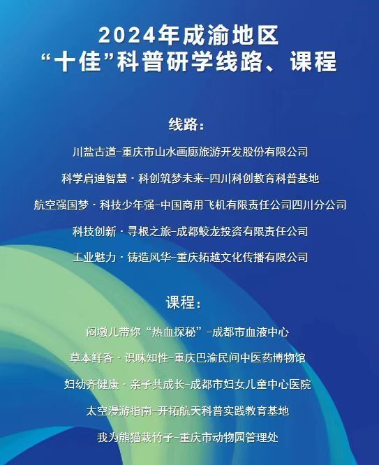近年來(lái),成渝兩地的科普基地在科普能力提升、科普活動(dòng)策劃開(kāi)展等方面深耕細(xì)作,創(chuàng)新性地開(kāi)展了一系列科普工作,各具特色,并取得了較好的成效。活動(dòng)現(xiàn)場(chǎng)對(duì)2024年成渝地區(qū)“十佳”科普研學(xué)線路、課程、基(營(yíng))地和導(dǎo)師進(jìn)行了授牌。其中,“十佳”科普研學(xué)線路和課程包括川鹽古道、科學(xué)啟迪智慧·科創(chuàng)筑夢(mèng)未來(lái),我為熊貓摘竹子等;“十佳”科普研學(xué)基(營(yíng))地和導(dǎo)師包括成都博物館、成都川菜博物館,重慶師范大學(xué)的付文博等。