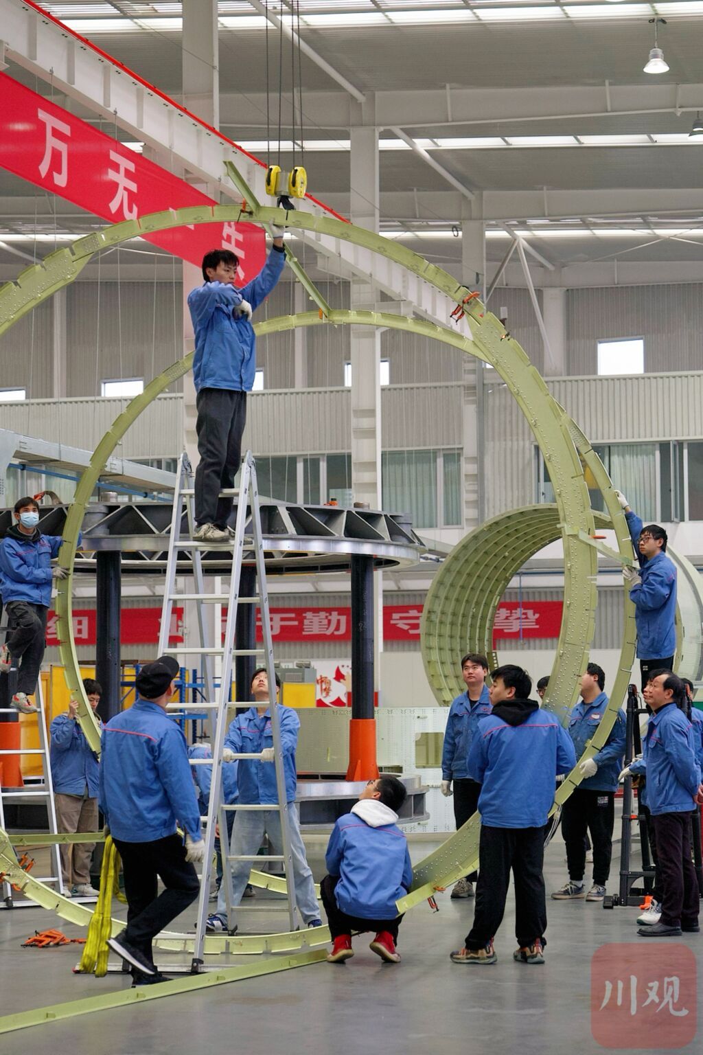 “躺”在地上的空心圓柱體,是已經(jīng)鉚接完畢的朱雀二號(hào)艙段?!?萬(wàn)多顆鉚釘,每顆打在哪兒都要精確,一個(gè)蘿卜一個(gè)坑?!背碳蛹医榻B,3.35米直徑的艙段,對(duì)接時(shí)要將偏差控制在0.5毫米以內(nèi),從而保證箭體受力均勻。