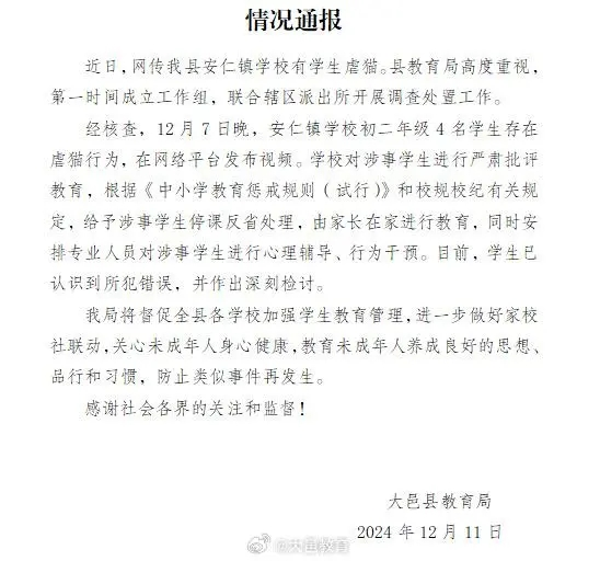 ·成都4名中學(xué)生組團(tuán)虐貓,官方:嚴(yán)肅批評(píng)教育,停課反省。