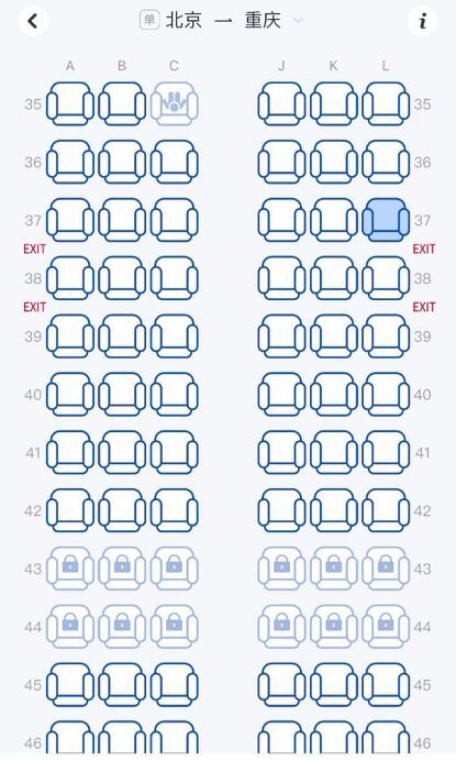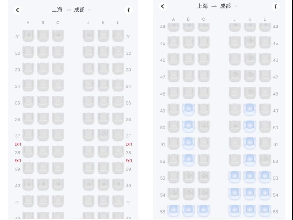 在上海工作的孟雨在8月上旬購買了一張9月初從上海飛成都的機(jī)票,提前大半個(gè)月預(yù)選座時(shí),孟雨發(fā)現(xiàn)該趟航班上約80%座位被“鎖”了,其中31-48排的108個(gè)座位里,除6個(gè)座位顯示已被選之外,其他座位均為灰色呈“鎖定”狀態(tài),而在49-52排的42個(gè)座位里,只剩最后三排及中間座位可選。