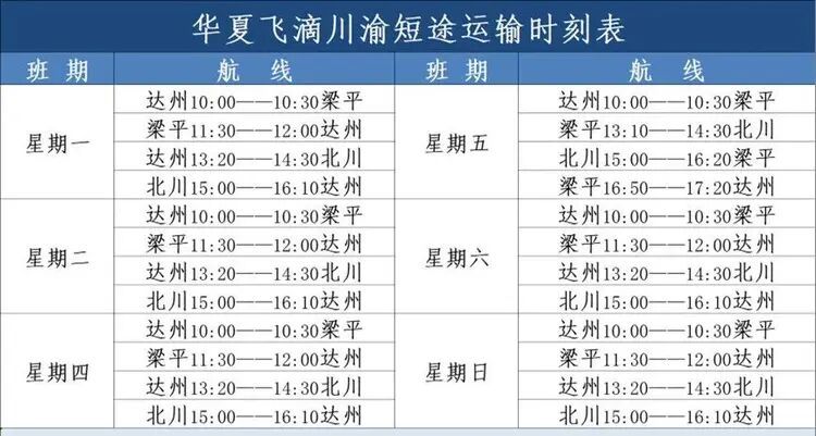 12月9日,華夏飛滴率先發(fā)布官方消息,將于近期開通達州至梁平、達州至北川、北川至梁平三條全新的短途運輸航線,為川渝旅客提供更快捷、更舒適的出行選擇。