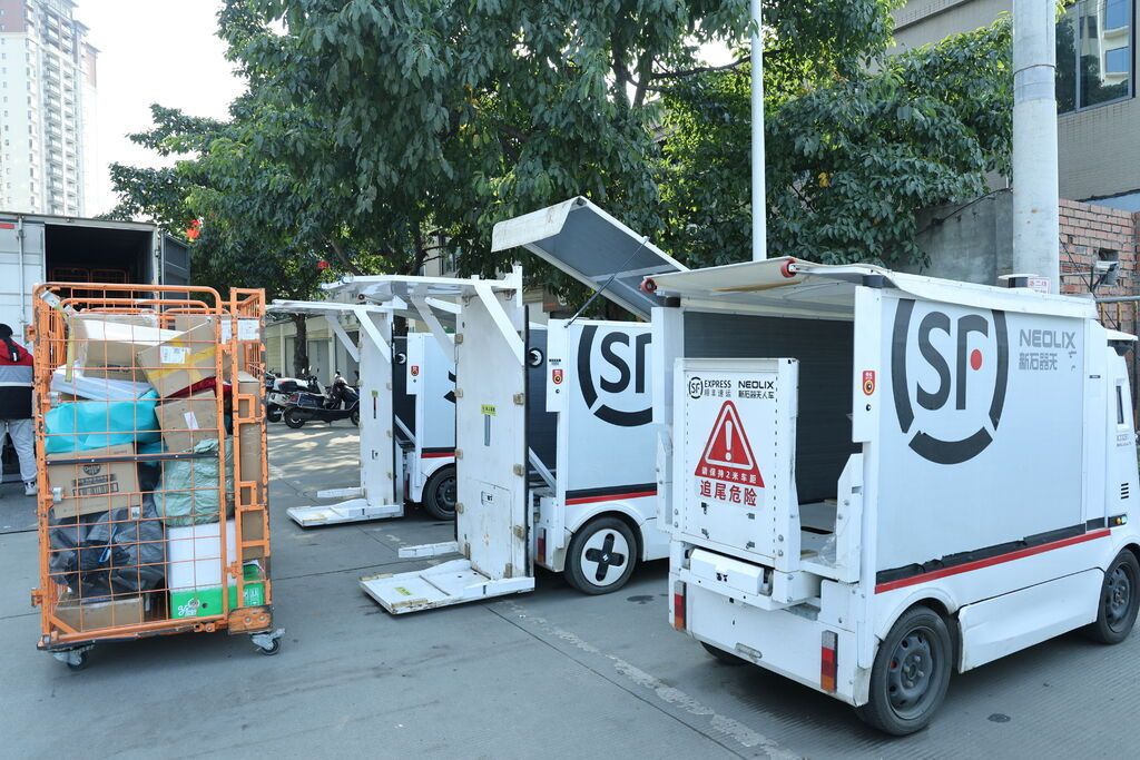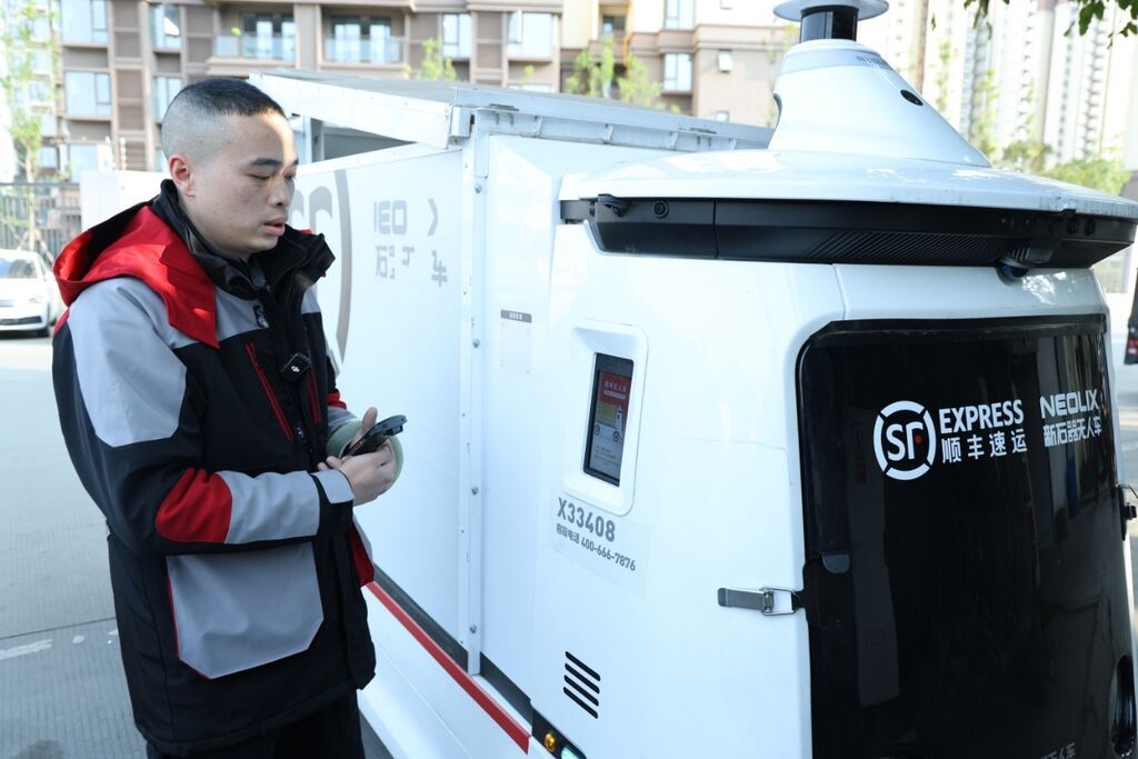 “車輛左轉(zhuǎn),請注意安全!”……今日,記者在位于龍泉驛區(qū)十陵街道的順豐來龍村營業(yè)站點看到,幾輛無人配送車整齊排列,特別醒目。只見工作人員將快遞物件放置貨物架(倉)后,通過手機掃碼、輸入驗證碼等程序,車輛啟動并按照設(shè)定好的路線“指令”自動前往目的地。