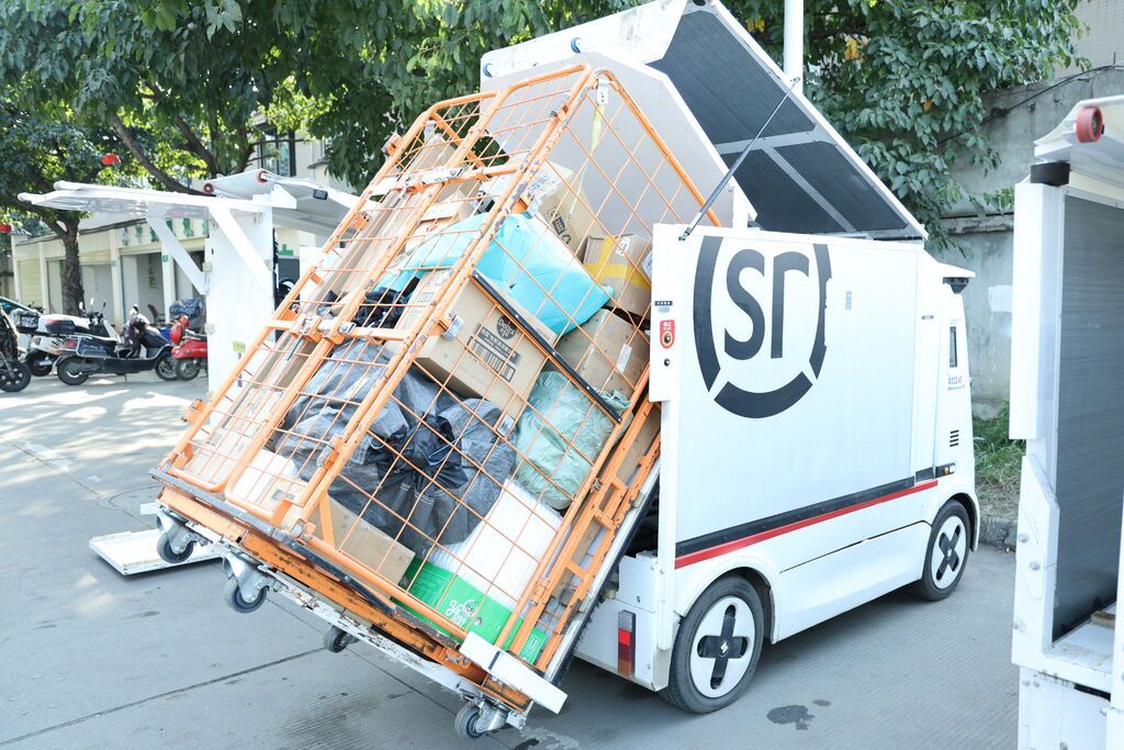 這些無人配送車看起來袖珍矮小,行動卻靈巧方便。從外表上看,渾身白色的無人配送車線條圓潤,車上裝有十多個激光雷達和攝像頭等感知設(shè)備,可完成360度無死角環(huán)視,做到“眼觀六路、耳聽八方”。它們的身軀不大,車廂內(nèi)卻能一次性裝納數(shù)百件不同尺寸的包裹,充滿一次電能跑100公里以上,是名副其實“吃得少干得多”。