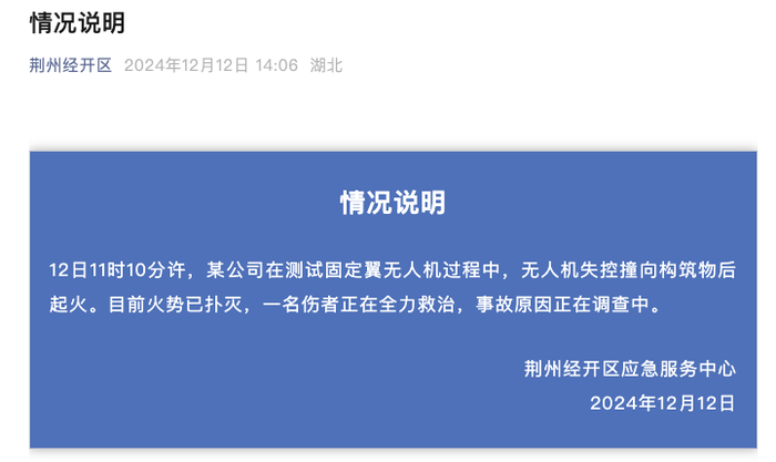·湖北荊州通報一大型無人機墜落:無人機測試中失控撞向構筑物后起火,1人受傷。