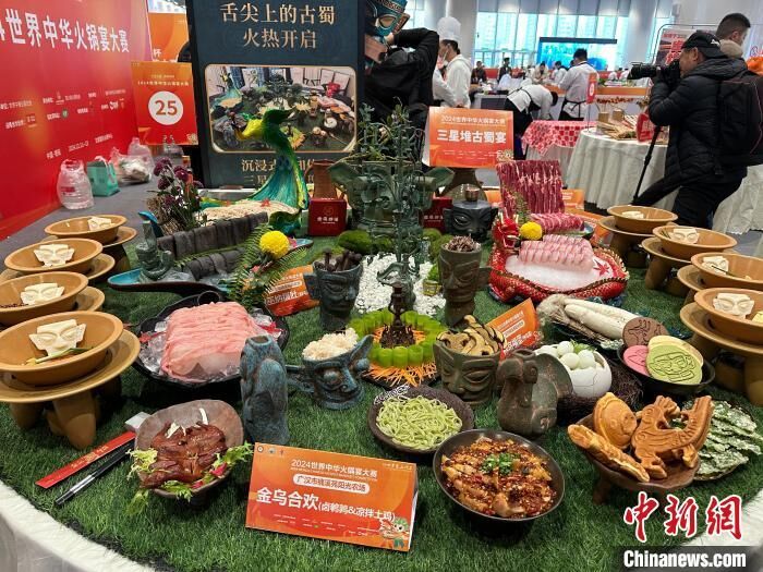 比如,“三星堆古蜀宴”正中擺放青銅神樹、青銅縱目人像等知名文物的模型,火鍋底料使用的牛油也做成“青銅面具”;鵪鶉蛋命名“神鳥福蛋”,脆毛肚則取名“靈巫納福肚”。該宴席負(fù)責(zé)人張小紅表示,希望民眾能在吃火鍋的同時(shí)感受古蜀文化的魅力。