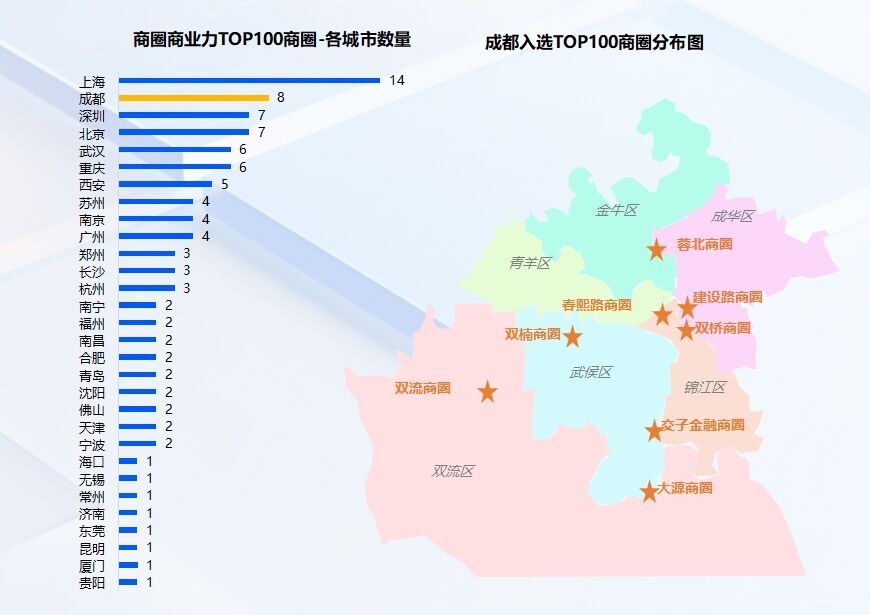 12月12日,2024年度《中國商圈商業(yè)力指數(shù)榜單》發(fā)布會在蓉舉行?,F(xiàn)場發(fā)布的《中國商圈商業(yè)力指數(shù)榜單》顯示,成都共有8個商圈進入全國前100名,上榜數(shù)量居全國第二,分別為春熙路商圈、交子金融商圈、雙橋商圈、大源商圈、蓉北商圈、雙楠商圈、雙流商圈、建設(shè)路商圈。其中,春熙路商圈、交子金融商圈進入全國前10名。