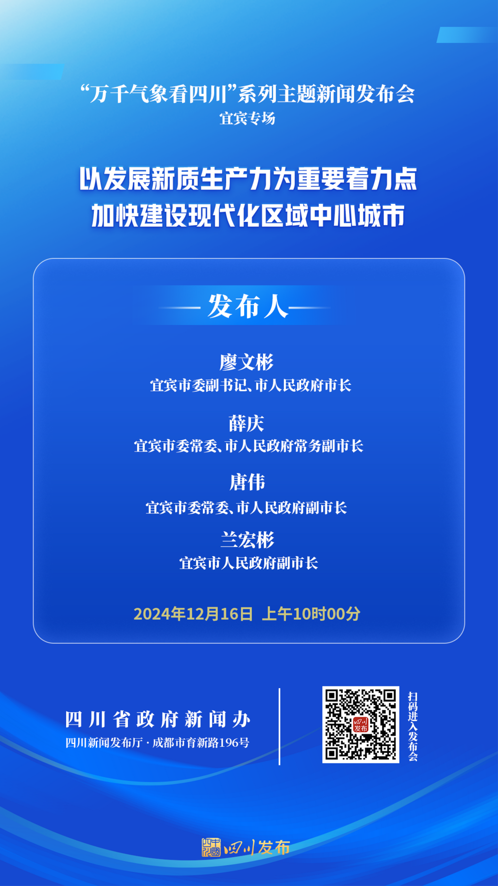 2024年12月16日(星期一)10:00,省政府新聞辦將在四川新聞發(fā)布廳舉行“萬千氣象看四川”系列主題新聞發(fā)布會宜賓專場,請宜賓市委副書記、市人民政府市長廖文彬圍繞“以發(fā)展新質(zhì)生產(chǎn)力為重要著力點(diǎn),加快建設(shè)現(xiàn)代化區(qū)域中心城市”作介紹,宜賓市委常委、市人民政府常務(wù)副市長薛慶,宜賓市委常委、市人民政府副市長唐偉,宜賓市人民政府副市長蘭宏彬?qū)⒊鱿⒒卮鹩浾咛釂枴K拇òl(fā)布客戶端將全程圖文直播,敬請關(guān)注!